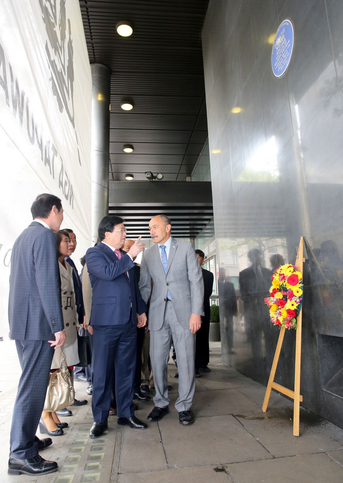 Trong khuôn khổ chuyến thăm, Phó Thủ tướng đã đặt hoa tưởng nhớ Chủ tịch Hồ Chí Minh tại nơi trước đây là khách sạn Carlton, nơi Người từng làm việc vào năm 1913. Sau chiến tranh, khách sạn Carlton bị bom phá huỷ phần trên, nhưng phần hầm ngầm, nơi có căn bếp Bác Hồ từng làm việc vẫn còn nguyên vẹn. Hiện nay, Chính phủ New Zealand đã mua lại diện tích này và xây lên toà nhà New Zealand House. Ảnh: VGP/Xuân Tuyến