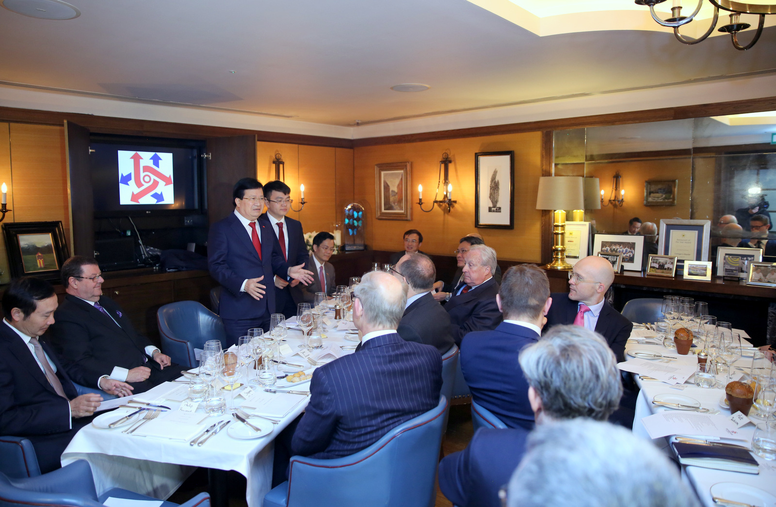 Tại cuộc ăn trưa làm việc với lãnh đạo các doanh nghiệp Anh, Phó Thủ tướng Trịnh Đình Dũng khẳng định, Việt Nam sẽ tiếp tục đẩy mạnh cải cách thể chế, cải thiện môi trường đầu tư, kinh doanh, tạo điều kiện thuận lợi cho doanh nghiệp Anh đến hợp tác đầu tư, kinh doanh hiệu quả tại Việt Nam. Ảnh: VGP/Xuân Tuyến