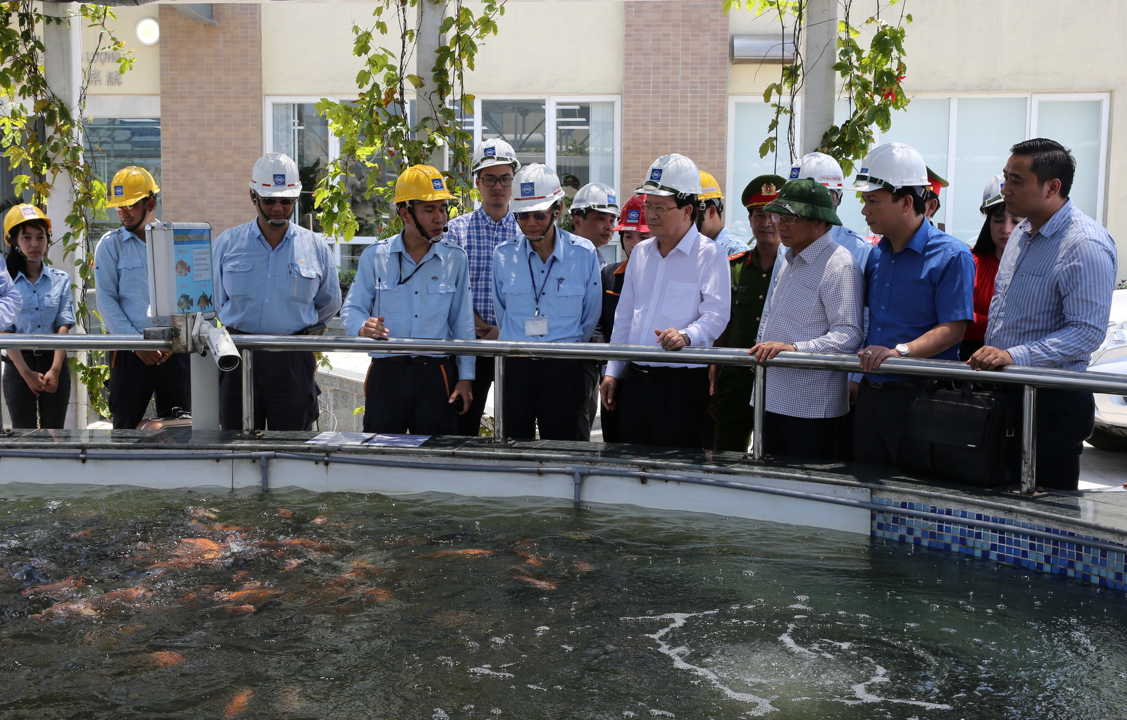 Phó Thủ tướng kiểm tra bể nước thải sau xử lý. Hiện tại, doanh nghiệp đã cho thả cá vào bể, có camera theo dõi sức khoẻ đàn cá, truyền hình ảnh ra ngoài cổng nhà máy 24/24h để người dân giám sát. Ảnh: VGP/Xuân Tuyến
