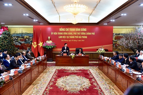 Phát biểu tại cuộc làm việc, Phó Thủ tướng Trịnh Đình Dũng ghi nhận, đánh giá cao những kết quả rất ấn tượng trong phát triển kinh tế, xã hội của thành phố Hải Phòng trong năm 2017 và 2 tháng đầu năm 2018.
