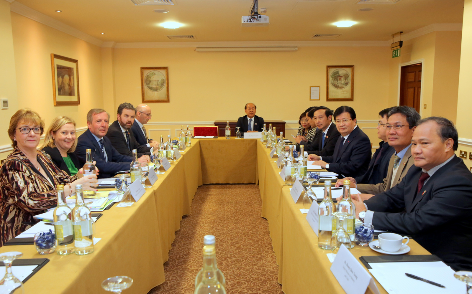 Làm việc với Bộ trưởng Ngoại giao và Thương mại Charles Flanagan, Phó Thủ tướng Trịnh Đình Dũng khẳng định coi trọng quan hệ hợp tác với Ireland; đề nghị Ireland tích cực ủng hộ EU sớm ký và phê chuẩn Hiệp định Thương mại tự do với Việt Nam và công nhận nền kinh tế thị trường của Việt Nam; đề nghị tăng thêm học bổng cho sinh viên Việt Nam; tạo điều kiện cho cộng đồng người Việt Nam tại Ireland hòa nhập tốt tại đây.