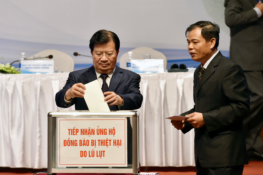 Ngay tại Hội nghị, Phó Thủ tướng Trịnh Đình Dũng cùng tất cả các đại biểu tham dự đã quyên góp chia sẻ với những khó khăn, mất mát mà đồng bào tại các tỉnh đang bị thiệt hại do mưa lũ gây ra.